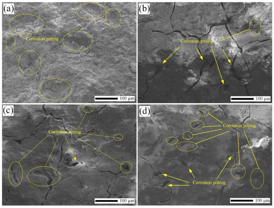 SEM photographs of corrosion pitting pits on the surface of magnesium before and after laser shock peening: (a) untreated; (b) 1.19 GW/cm2; (c) 1.99 GW/cm2; (d) 2.79 GW/cm2.
