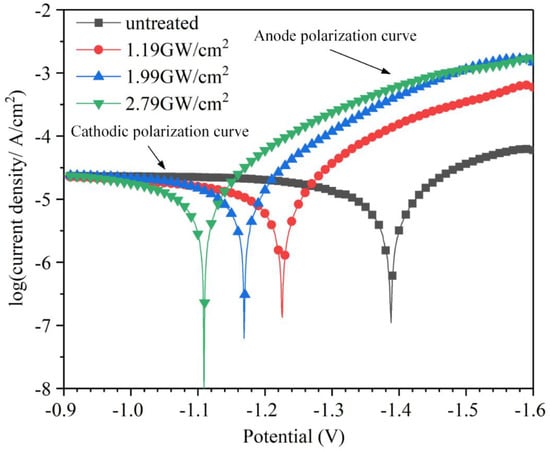 The standard electrode potential of magnesium is −2.37 V, which makes magnesium chemically active, and any method that can increase its potential has reference significance. Therefore, it is necessary to study the electrochemical properties of magnesium alloy ZK60 in SBF after laser shock peening. Potentiodynamic testing was conducted to original magnesium alloy ZK60 and laser impacted samples in the SBF solution. The polarization curves of the four samples are recorded in Figure 14. Simultaneously, corrosion current density and corrosion potential are correspondingly summarized in Table 4. The experimental results reveal that the corrosion potential positively shifts after LSP, and the value of corrosion current density is less than the untreated one. Thereinto, the corrosion voltages of untreated, 1.19 GW/cm2, 1.99 GW/cm2, and 2.79 GW/cm2 were −1.3884 ± 0.04 V, −1.2256 ± 0.03 V, −1.1707 ± 0.05 V, and −1.1094 ± 0.03 V, respectively. The maximum offset of corrosion potential was 217.7 mV. Meanwhile the corrosion current densities were equal to 1.378 × 10−5 A/cm2, 1.267 × 10−5 A/cm2, 1.23 × 10−5 A/cm2, and 1.196 × 10−5 A/cm2, respectively. The increase in laser power density resulted in a maximum increase in corrosion potential of 20.1% and a maximum reduction in corrosion current density of 13.2%. It can be seen that LSP can improve the corrosion potential of magnesium alloy ZK60 and reduce the corrosion current density. The corrosion potential increases with the increase of laser power density, and the change trend of corrosion current density is the opposite. This is mainly due to the increase in residual compressive stress and grain refinement.
