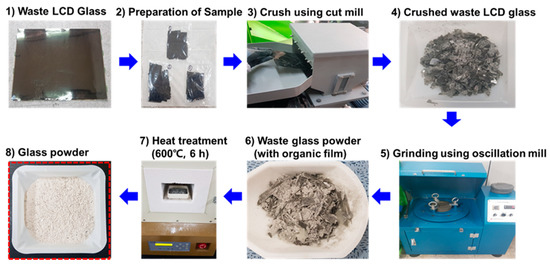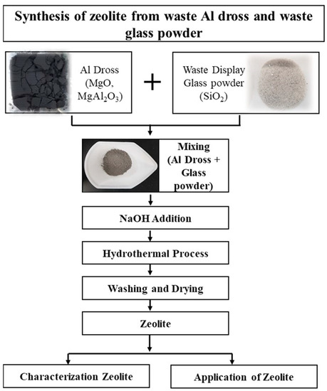 All chemicals like were of analytical grade and were used without further purification, supplied by Daejung chemical and metal Co, Ltd. (Siheung-si, Korea). Al dross (MgO, MgAl2O3) and waste displayed glass powder which are the primary source of SiO2 was used for the synthesis of zeolite. Waste displayed glass powder was obtained through a series of processes like size reduction, crushing, grinding, and heat treatment. The process flow chart for waste displayed glass powder collection is presented in Figure 1.