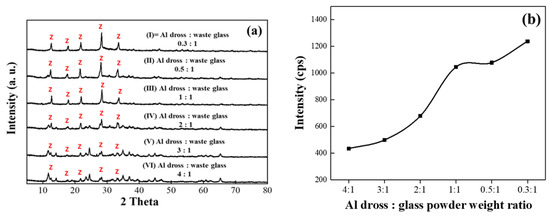 Zeolite was synthesized using different weight ratios of Al dross and waste LCD glass by hydrothermal synthesis route using NaOH. The particle size of both Al dross and waste displayed glass powder were analyzed, the average particle size was 13.41 and 5.68 μm, respectively. The weight ratio variations for Al dross and waste LCD glass in this study were 0.3:1, 0.5:1, 1:1, 2:1, 3:1, and 4:1 using 2 M NaOH hydroxide. The experimental parameter used for studies is presented in Table 1. The requisite weight ratio of Al dross and waste LCD glass powered were mixed thoroughly. The powder mixture of Al dross and waste LCD glass was added to 2 M of NaOH at 100 g/L into the hydrothermal reactor. The reaction was carried out at 90 °C and 24 h under constant stirring of 200 rpm. After cooling, the separated zeolite was characterized by XRD and SEM. Figure 3a represents the XRD pattern for synthesized zeolite, which has been synthesized at different composition ratios. XRD in Figure 3a indicates that at lower Al dross composition clear and sharp XRD peaks were observed in contrary to higher Al dross composition where broad and comparatively less sharp XRD peaks were observed. Figure 3b compares the intensity of the primary peak of synthesized zeolite which has been extracted from Figure 3a. Figure 3b clearly indicates that intensity of primary peak in XRD follows the order as 0.3:1 > 0.5:1 > 1:1 > 2:1 > 3:1 > 4:1 for Al dross and waste LCD glass in the weight ratio variation study. Figure 3 clearly indicates that for Al dross lower composition ratio shows better crystallization of the zeolite.