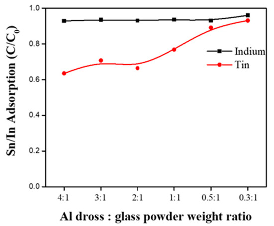 From the application perspective, indium and tin extrication from mixed metal solution was investigated using synthesized zeolite as an adsorbent. Each of the zeolite samples synthesized with the above process was investigated for indium and tin separation by adsorption technique. Adsorption behavior of the synthesized zeolite is depicted in Figure 5. Figure 5 indicated, after 24 h, a significant fraction of indium and tin was adsorbed using zeolite synthesized from different weight ratios of Al dross and waste LCD glass. The figure indicates a fraction of metal extracted by zeolite as a function of the composition of Al dross and waste LCD glass weight ratio in the zeolite. The figure indicated indium extraction was independent of zeolite composition ratio whereas extraction was independent of zeolite composition. Despite Al dross composition variation in the zeolite, the indium extraction was averaged 93.66%. As Al dross fraction decreases in the zeolite tin extraction increased, which varies from 63.50 to 93.10%. Figure 5 indicates that indium and tin separation is not quite efficient, but, using synthesized zeolite both the metal can be extracted quantitatively. Figure 5 clearly opens the opportunity for prospective application of zeolite for indium and tin recovery from leach solution even at a very dilute solution.
