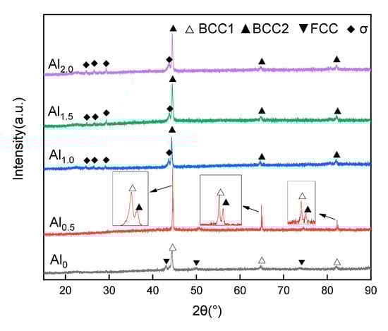 X-ray diffraction patterns from the AlxCoCrFe2.7NiMo coatings are shown in Figure 1. The coatings are mainly composed of simple solid solutions and intermetallic compounds. The phase structure is composed of both BCC and FCC solid solutions when x = 0, while BCC1 and BCC2 solid solutions appear and the peak value is more intense when x = 0.5. Tiny Bragg peaks corresponding to the σ and BCC phases are visible in the XRD pattern when x = 1.0, and no new phase appears in the XRD pattern as the Mo content increases (x = 1.5 and 2.0).