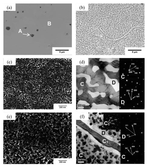 SEM images of the microstructure of the AlxCoCrFe2.7MoNi (x = 0, 0.5, 1.0, 1.5, 2.0) coatings are shown in Figure 2a–c, e, and g. In view of the fineness of microstructure and the limitations of the SEM, TEM images of the microstructures of Al1.0, Al1.5, and Al2.0 HEAs are presented in Figure 2d, f and h. The target composition and actual composition of the coatings measured by EDS are listed in Table 3. The chemical compositions in different micro-regions of AlxCoCrFe2.7MoNi are shown in Table 4. A few precipitates containing Fe and Cr appear in region A of the coating without Al, as shown in Figure 2a. Figure 2b shows that the Al0.5 coating consists of dendrites. Figure 2c,e,g shows that Al1.0, Al2.0, and Al3.0 alloys have fine microstructures, respectively. The light and dark phases appear in Al1.0, indicated by D and C, respectively, as shown in Figure 2d. The EDS results and analysis of the diffraction spots show that the C phase is a Mo-rich σ phase, and the D phase is an (Al, Ni)-rich BCC2 phase. Figure 2f shows that two kinds of dark areas (granules and sheets) and one bright area can be seen in the Al1.5 coating, indicated by C, C1, and D, respectively. An analysis of the diffraction spots show that the C and C1 phases belong to the (Mo, Cr)-rich σ phase, while the D phase is an (Al, Ni)-rich BCC2 phase. The dark strip disappears as Mo content increases, as shown in Figure 2h, and the microstructure is composed of a granular (Mo, Cr)-rich σ phase and (Al, Ni)-rich BCC2 phase.