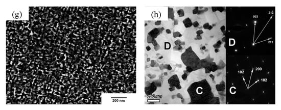 Microstructures of the AlxCoCrFe2.7MoNi coatings. (a–c,e,g) show SEM images; (d,f,h) show TEM images.