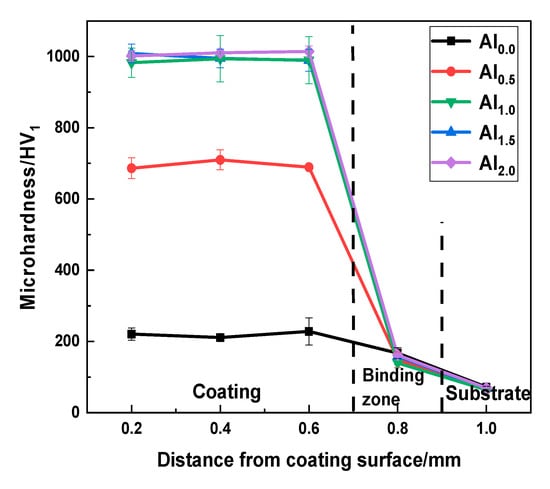 The microhardness measurements from different positions in the AlxCoCrFe2.7MoNi coatings are shown in Figure 3. The CoCrFe2.7NiMo alloy has the lowest average hardness (272 HV), which can be attributed to generation of the FCC phase. The microhardness increases as Al content increases, and Al2.0CoCrFe2.7NiMo has the highest average hardness (1142 HV). Hardness test results show that the formation of the BCC2 phase increases the hardness of the coating.