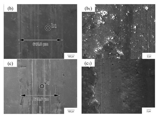 Wear in a material is related to its structure and external environment. The wear resistance of samples Al1.0, Al1.5, and Al2.0 was analyzed in this paper. The morphology of worn AlxCoCrFe2.7MoNi (x = 1.0, 1.5, 2.0) coatings is shown in Figure 4a1–c1 are enlarged partial details of Figure 4a–c, respectively. There is a convex scaly plastic deformation layer on the friction surface of the Al1.0 sample, as shown in Figure 4a,a1, which resulted from repeated grinding during the wear test. An oxide developed at the junction of the flaky furrow and the scaly deformed layer because of severe friction and high temperature during the wear test. The wear mechanism is mainly adhesive wear and oxidative wear. The wear of the Al1.5 sample is with a few flake furrows, in which oxides were found, as shown in Figure 4b,b1, indicating the wear occurs via oxidation, slight adhesion wear and slight abrasive wear. Sample Al2.0 also exhibits a scaly plastic deformation layer with oxides and a flaky furrow in Figure 4c,c1. The wear mechanism in sample Al2.0 is adhesive wear and oxidative wear. The measured weight losses from the coatings due to wear are listed in Table 5; sample Al2.0 exhibited the least wear of 0.1 mg.