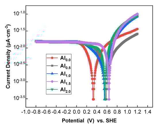 Polarization curves of AlxCoCrFe2.7MoNi coatings in a 3.5 wt.% NaCl solution.