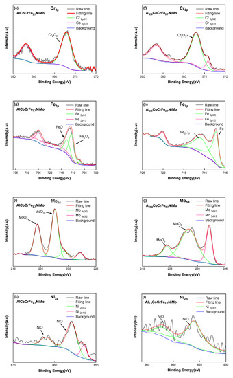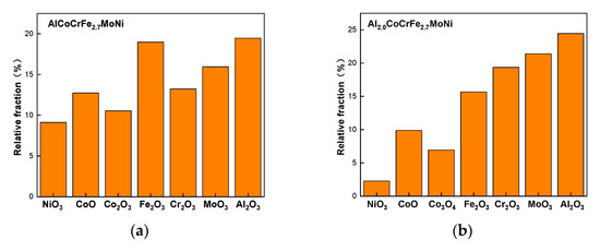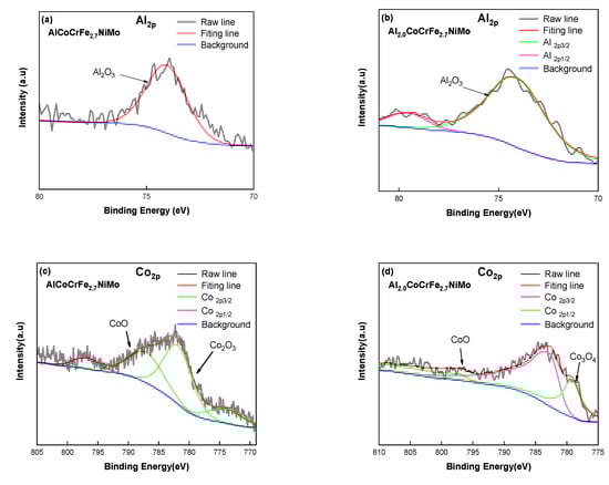 Potentiodynamic polarization curves of the AlxCoCrFe2.7MoNi coatings in the 3.5 wt.% NaCl solution are shown in Figure 5. The Ecorr and Icorr of the coatings were obtained by Tafel linear extrapolation, as shown in Table 6. These results show that, except for sample Al1.0, the self-corrosion potential of the other coatings increases as the Al content increases. The self-corrosion current density with sample Al1.0 is the least, while the self-corrosion current density with samples Al1.5 and Al2.0 are slightly larger. Sample Al0.0 exhibits the lowest self-corrosion potential and higher self-corrosion current density, indicating that it has the greatest corrosion tendency, highest corrosion rate and worst corrosion resistance. Figure 6 shows XPS results from passive films on the AlxCoCrFe2.7NiMo (x = 1.0, 2.0) coatings after the corrosion experiments in the 3.5 wt.% NaCl solution. The composition of the passive film is Al2O3, CoO, Co2O3, Cr2O3, Fe2O3, MoO3, and NiO when x = 1.0, while the passive film is primarily composed of Al2O3, CoO, Cr3O4, Fe2O3, MoO3, and NiO when x = 2.0. Al2O3, Cr2O3, CoO, MoO3, and NiO were detected on the surfaces of all coatings, which can provide certain protection in a corrosive environment. The compositions (in relative at.%) of the passive films determined from XPS measurements are summarized in Figure 7. This shows that the content of Al2O3 is higher than that of other metal oxides, and the relative contents of Ni, Co and Fe oxides decrease as the Al content increases. This is primarily due to the fact that Al is active and oxidizes easier than the other elements listed here.