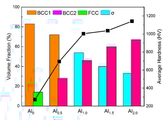 Hardness and wear resistance of alloys are closely related to their microstructures. Figure 9 shows the relationship between the volume fraction of the phases in the coating, obtained by XRD and the hardness of the coating. The presence of the FCC phase minimizes the hardness of the Al0 alloy, and formation of (Al, Ni)-rich BCC2 causes the hardness of the Al0.5 alloy to increase. The volume fraction of BCC2 phase has a greater influence on the hardness and wear resistance of the coatings than does that of σ phase. Greater content of the (Al, Ni)-rich BCC2 phase correlates with higher hardness and wear resistance as the Al content increases. However, the presence of the flaky σ phase causes large flaky exfoliation on the Al1.0 coating in wear resistance experiments, which can be attributed to the brittleness of the σ phase. It is worth noting that the σ phase changes from sheet-like to granular as the Al content increases further, which plays a role of dispersion strengthening in the alloy. Furthermore, plastic deformation can be observed in the wear microstructure diagram of the Al1.0 coating, while no plastic deformation can be observed in the Al1.5 and Al2.0 coatings. Oxides appear, which indicates that oxidation wear is the primary wear mechanism, and dispersion strengthening can significantly increase the coating’s wear resistance. In summary, introduction of the (Al, Ni)-rich BCC2 phase increases the hardness and wear resistance of the coating. Adding Al reduces the size of the σ phase, which also increases the hardness and wear resistance of the coating.