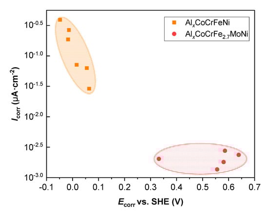 Comparison of the corrosion properties of AlxCoCrFe2.7NiMo HEAs and AlxCoCrFeNi HEAs in a 3.5 wt.% NaCl solution.