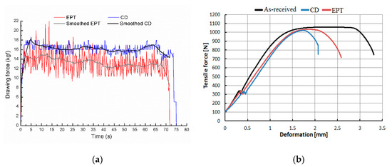 (a) Drawing forces (kg) as a function of time (s). (b) Tensile forces (N) as a function of drawing deformation (mm). EPT = electropulsing treatment. CD = conventional cold wire drawing process.