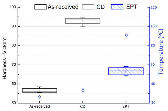 Table 3 shows the comparison of the electrical resistivity of copper wire drawn by CD and EPT processes. It can be seen that no change in resistivity has been observed during the EPT process. On the contrary, the experimental results [3] have shown that the resistivity of stainless-steel wires with the application of current pulses was decreased by 10% due to retardation in the micro-crack growth rate and reduction in grain boundary cracking [17]. It seems that the rise in temperature, when considering the electroplastic effect in the EPT process of copper wires, makes a small contribution to the changes in the crack initiation and vacancies on the surface of wire. A statistical analysis was carried out to assess whether the CD and EPT values presented significant differences. Accordingly, firstly a Kolmogorov–Smirnov test was completed to denote that the values do not have normal distributions. Consequently, a Wilcoxon–Mann–Whitney test showed a p-value of 0.074, thus there is no statistical difference between both processes and, subsequently, there are no significant differences in the resistivity values. On the other hand, the material hardness of the EPT specimens decreases by 28–33% as compared to the CD specimens, as shown in Figure 3. The hardness and resistivity values were taken with an average of five measurements along the length of the specimen.