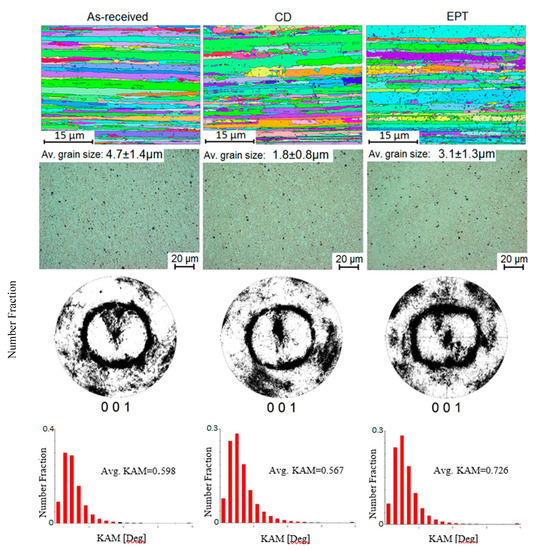 Microstructure in the longitudinal (first row, electron backscatter diffraction, EBSD) and cross-section views (second row, optical), (001) pole figures (third row) and Kernel Average Misorientation (KAM, fourth row) of the as-received CD and EPT specimens.