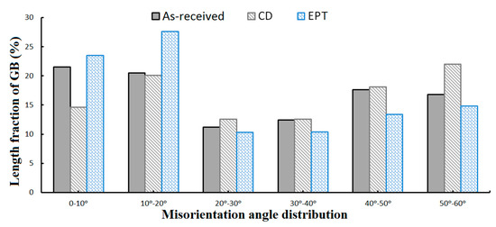 For further analysis of the grain boundaries, Figure 5 shows the length fraction (LF) of grain boundaries at different misorientation angles. It is observed that at smaller angles, the LF for CD samples is lower than for the EPT specimens. However, as the misorientation angle increases, the LF decreases for the EPT samples. Dislocations create arrays of high angle boundaries (HAB) during CD. Although during the EPT the low angle grain boundaries (LAGB) tend to be stabilized, due to the continuous recrystallization caused by a localized heating [18]. There is no evidence of twining detected, either by Coincident Site Lattice (CSL) or by any other misorientation characteristic Grain average misorientations (GAM) were also calculated and they are in fair agreement with the Kernel Average Misorientations (KAM) shown in Figure 4. The distributions are fairly lognormal with average values shown in Table 5. The presented values are different from the ones shown for the particular scans in Figure 4, but the general behavior is similar. Unexpected diminishment in the CD sample, for all methods (KAM, GAM, HAGB, LAGB) that evaluate defect storage, suggests that continuous dynamic recrystallization (CDR), somehow cleans up some defects without any extra external heating and is only driven by the same deformation and temperature of the samples. It is expected that these microstructure changes reflect local heat treatments influencing the development of residual stresses in the wire, which is crucial for the number of drawing steps before annealing treatment.