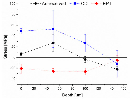 The tensile residual stresses developed due to inhomogeneous deformation cause splitting at the surface of wire during the drawing process [19]. The use of EPT decreased the residual stresses and they decreased further with the increase in current density [20]. The residual stresses were recorded in the as-received and after wire drawing states in CD and EPT processes to describe the stresses from the surface through the in-depth direction. Figure 6 shows the results of residual stresses in the in-depth direction for the three configurations. The average values are the average of four measurements by the Sin2φ method. The error bars show the standard deviation of these measurements.