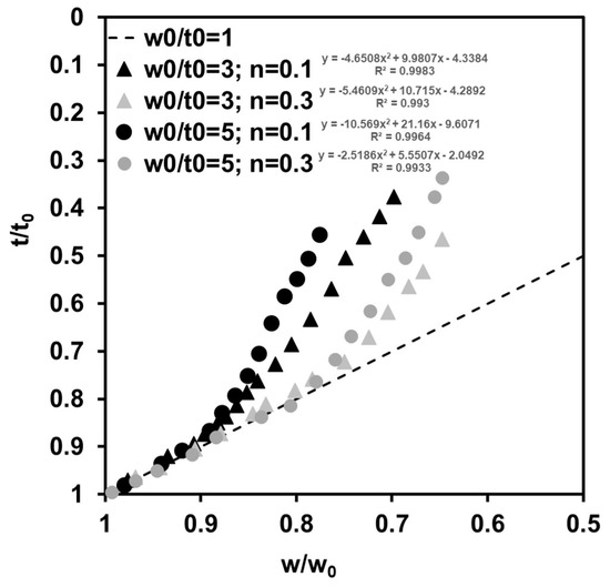 - It is possible to correlate the relationship between initial (w0 = 2.5 mm) and current width (w) with the initial (t0 = 1 mm) and current thickness (t) after every test interruption. According to [18], if the strain hardening exponent (n) is known, as well as the thickness and width relation, it is feasible to get this relationship; see Figure 1, obtained from data extracted from [18] after some linear extrapolation. In the present work, w0/t0 = 2.5 and the n ≅ 0.16.