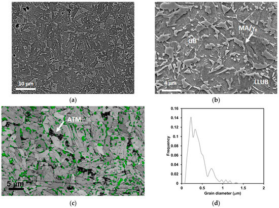 Two crystalline structures were considered in the EBSD work: BCC (body centered cubic-ferrite) and FCC (face centered cubic-austenite). The bainitic ferrite and the auto-tempered martensite (ATM) are indexed as BCC. The distinction between these two micro-constituents relied on the average EBSD pattern quality. In general, the ATM has a lower pattern quality (PQ)—darker in the PQ maps—than bainite—brighter in the PQ maps. Nevertheless, the amount of ATM is indeed low—below 2%. The sample preparation went through a soft grinding and was finally gently polished down to colloidal silica (0.05 μm) to avoid austenite transformation. Special attention was paid to the clean-up procedure to achieve reliable methods. In general, the scans showed a rate of success above 85–90%. As a result of the clean-up procedure, less than 5% of the data were re-indexed.