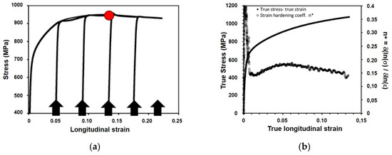 Regarding X-ray diffraction, the scans were performed in a Philips PW1825 diffractometer (Philips Analytical, Almelo, The Netherlands) with an angular step size of 0.02° and with Cu–Kα radiation to determine the amount of volume fraction of retained austenite after every interruption before necking in the angular range 2θ, 40°–120°. The calculations of the volume fraction of retained austenite were done according to ASTM E975-13 for 4 diffraction peaks: {200} and {220} for austenite and {200} and {211} for ferrite, and the constants for the Cu–Kα radiation were extracted from Jarvinnen’s work [19]. The carbon content of the austenite in the initial state was determined according to equation aγ = 3.572 + 0.033 wt.% C + 0.0012 wt.% Mn-0.00157 wt.% Si [20].