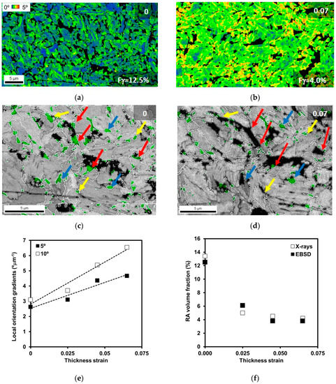 EBSD-KAM (Kernel Average Misorientation) map and pattern quality+austenite (green colored grains) maps with overlaid white grain boundaries (>15°) for two strain conditions (a) and (c) initial state, and (b) and (d) after thickness strain of 0.07. (e) Local orientation gradients in the bainite matrix (based on the maximum kernel values of 5° and 10°, respectively) and (f) RA volume fraction evolution with the strain.
