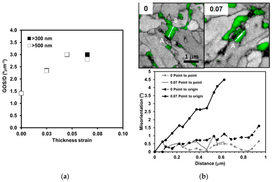 The quantification of the volume fraction of retained austenite exhibits a steep drop for low strains within the uniform deformation region. Some previous austenitic grains, as just explained above, are either not indexed anymore or are partially indexed. This lack of indexing is commonly reported to be a consequence of the presence of high-carbon martensite, which shows a very poor or no pattern in conventional EBSD, or it is observed as an area with low pattern quality (PQ) and a high dislocation density [30]. Thus, blackened regions are related to retained austenite that undergoes induced martensitic transformation (TRIP effect). In the present study, the transformation of retained austenite mostly occurs before 0.025 thickness strain is achieved. This agrees with the shape of the strain hardening rate, which reaches a maximum close to 0.025 thickness. This strain corresponds to 0.05 longitudinal strain in Figure 3a. Afterwards, the amount of retained austenite remains almost constant at a value of 4–5%, nearly 30% of the initial RA volume fraction, up to 0.08 thickness strain and 0.13 longitudinal strain. Therefore, the enhancement of the ductility based on the TRIP effect is limited to the very first stages of the deformation and, after 0.05 thickness strain, dislocation plasticity and crystal rotations rule the ductility of the austenite grains, also reported in [30]. The analysis of the behavior of the untransformed austenite grains with strain has been performed through the ratio of the GOS (Grain Orientation Spread) parameter and the grain size (D) for grains of austenite with diameters greater than 300 and 500 nm. The mean values of these two grain populations are about 500 and 800 nm, respectively. The GOS parameter measures the average misorientation of any point belonging to a grain with regard to the mean orientation of the grain. Therefore, this parameter looks at the whole grain, in contrast to the previously analyzed local orientation gradients. This kind of angular misorientation to distance-related parameters has also been proposed in [31]. The GOS/D rises monotonically with an amount of thickness strain up to 0.05 and can reach 3° μm−1 in spite of the small sizes of RA (Figure 5a). Depending on the minimum grain size considered, the mean austenite grain size is close to 500 and 800 nm. In terms of dislocation densities, the density of GNDs amounts to 3.7 × 1014 m−2 at the end of the uniform strain according to the formulation proposed by Mortensen and Kubin [32]. On the other hand, probably even slightly overestimated, the density is close to 1.4 × 1014 m−2 at the initial state. The rotation of the crystalline orientation of the austenite grains is readily observed in the point to origin misorientation profiles. In fact, in the RA grains corresponding to the initial state, some misorientation above the noise level is found, typically below 0.5–1°, reaching a value of 1.5° from one boundary to the opposite one. This is due to the crystalline rotations induced in RA during γ (austenite)→αB (bainite) phase transformation.