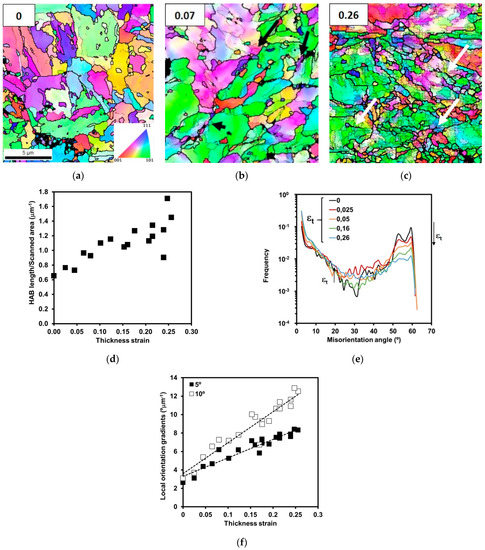 IPF (Inverse Pole Figure) maps (with respect the rolling direction) with different amounts of thickness strain. (a) Initial state, (b) 0.07 and (c) 0.26 (thick black lines >15°, thin black lines >2°). Evolution of (d) the density of high angle boundaries (HAB) as the ratio of the length of HAB per unit area, (e) misorientation distribution, and (f) local orientation gradients (for 5 and 10° angular thresholds) with the strain in the necking region (measured for distances of 200 nm).