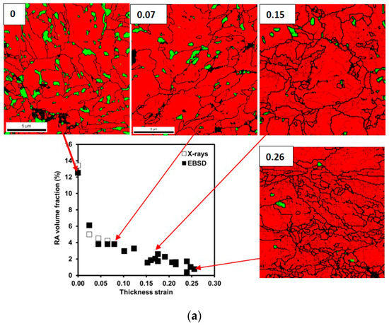 The mechanical stability of the retained austenite is a complex function of its morphology, size, surrounding phases, crystal orientation, and composition [26]. Specifically, the stability of retained austenite, when exhibits a block type morphology, has been observed to be low with respect to film-like retained austenite [27]. Here, the blocky type RA is the predominant morphology and the phases that are surrounding the RA grains can be either bainitic ferrite, high-carbon martensite belonging to MA islands or auto-tempered (low-carbon) martensite. The comparison of the maps of same region in Figure 4c,d for two strain levels allows observing that: