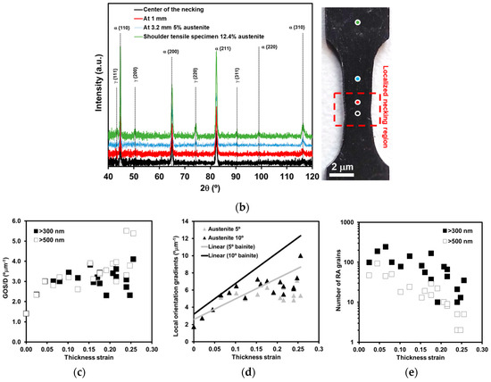 Regarding the change in GOS/D, a large scatter in the data extracted in the localized necking area is observed (Figure 7b). The minimum number of austenite grains measured in conditions larger than 300 nm was 10, whereas for 500 nm, it was two to five (Figure 7d). These minima are the ones achieved in the most strained conditions (0.24–0.26 thickness strain). The heterogeneity of the local deformation and the orientation of the retained austenite in the analyzed regions are possible causes for such scatter [30]. However, irrespective of the minimum austenite grain size, the average grain curvature parameter (GOS/D) seems to level off at a value of 3.5° μm−1. Compared to the bainitic matrix, the local orientation gradients, estimated like they were for bainite, show a clear stagnation at the large strain regime (Figure 7c). Instead, the bainite is able to accumulate the strain by formation not only of continuous misorientations that accumulate with distance, but also a subgrain structure, as illustrated in Figure 6c. This kind of subgrain structure is usually reported to increase its related misorientation as strain increases [39]. The stagnation value in the austenite is around 5.4 and 6.1 °μm−1 for the 5 and 10° angular thresholds. These values are lower than the ones for bainite at large strains, which exceed 8 and 11° μm−1. The stagnation of these two parameters in RA may arise from the combination of several factors. Larger strains may rotate RA grain to positions in which the transformation to martensite is induced. Another reason could be that, due to their small size (typically below 1 μm), the significance of the grain boundaries is relevant in the absorption–generation of dislocations and in the inhibition of the generation of substructure [40].