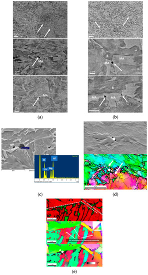 Back-scattered electron (BSE) micrographs showing the voids/damage at different locations in the necking region: (a) Bainite/secondary phase interface, (b) secondary phase islands fractured, and (c) inclusion/bainitic matrix. White arrows indicate the positions of the voids/cracks. EBSD-IPF map (with respect to the rolling direction) overlaid with boundary lines—thick (>15°) and thin (>2°) lines—close to a fractured secondary phase (d) in which white arrows point at the newly created high angle boundaries and (e) several EBSD maps that show the location of the irregularly shaped medium-sized retained austenite. Top: Phase map (austenite: green; bainite: red); middle: IPF map with regard to the rolling direction; bottom: IPF map+misorientation with regard to point A of retained austenite in the lower part of the scan.