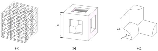 (a) A porous scaffold with cubic cell units; (b) A cubic cell; (c) an 1/8 cubic cell. Where a is the edge length of the cubic cell and r is radius of the strut.