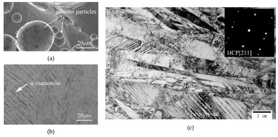 Smooth surfaces with some powder particles can be seen on the original scaffolds, as shown in Figure 3a. Columnar crystals with very fine acicular α’ martensitic structures along the building direction is a typical microstructure of the as-built Ti6Al4V, which was observed with OM and shown in Figure 3b. To confirm the conclusion, TEM was used to characterize the microstructure with bright field images (BFI) and identify the phase component with electron diffraction patterns (EDP). EDP of the primary materials confirms that the main phase component of the as-built samples is α’ martensitic structure and BFI shows acicular α’ plates fully filled with numerous twin crystals and dislocations, as shown in Figure 3c.