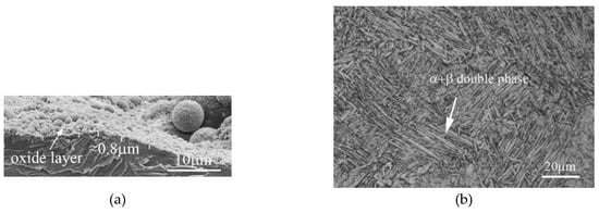 After HIP treatment, the surface topography of Ti6Al4V is changed obviously, the smooth surface with a silver-grey metallic luster turns into a surface adhered with rough black oxide. To characterize the surface oxide layer, SEM was used to observe the surface topography of the porous scaffolds and examine the thickness of the oxide layers. An average thickness of an 0.8 μm oxide layer formed a rough and uneven surface, seen in Figure 4a. The microstructure of Ti6Al4V transforms into an α + β dual-phase structure with an average thickness of 2 μm of α phase lamellae after HIP treatment, at a higher environmental temperature (950 °C) than the phase transition temperature (882 °C), shown in Figure 4b.