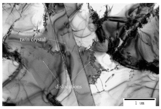 To further understand the phase transformation and the role of HIP treatment, the HIP-treated samples were characterized by TEM. The BFI presents the detail of the microstructure evolution and the EDP confirms the phase component. The EDPs of phases confirm that the original α’ phase were fully decomposed into an α phase with an HCP lattice structure and β phase with a BCC lattice structure. The BFI presents elongated α phase grains embedded in β phase grain boundaries, shown in Figure 5. Moreover, Figure 6 shows a decreasing density of dislocations and twin crystals in HIP-treated samples. Defects such as dislocations and twin crystals are contributing to the strengthening of materials. HIP treatment should result in a decline of the yield strength of L-PBF Ti6Al4V.