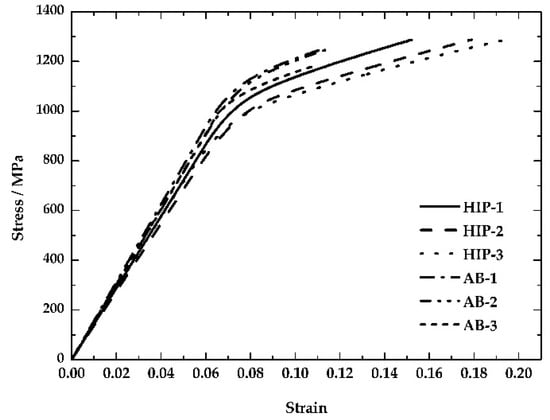 Mechanical properties can be characterized by stress-strain curves. Figure 7 shows compression curves of the as-built and HIP-treated samples, with dimensions shown in Figure 1a. The decreased compression stiffness and critical stress indicate that the property’s resistance to deformation reduced clearly after HIP treatment. As mentioned above, the microstructure of L-PBF Ti6Al4V transformed into α + β phases. First, plastic deformation of the β phase was much easier than in the original α’ phase. The decreased density of the twin grains and dislocation also reduced the resistance to plastic deformation. The compression stiffness (K) and critical stress (σc) are listed in Table 5.