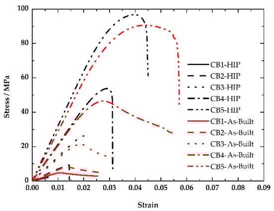 The compression curves of the as-built and HIP-treated Ti6Al4V.