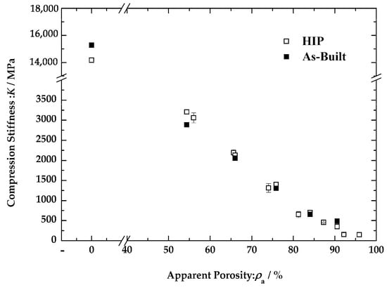 The relationship between compression stiffness and apparent porosity of the as-built and HIP-treated porous scaffolds.