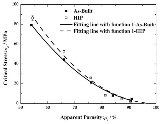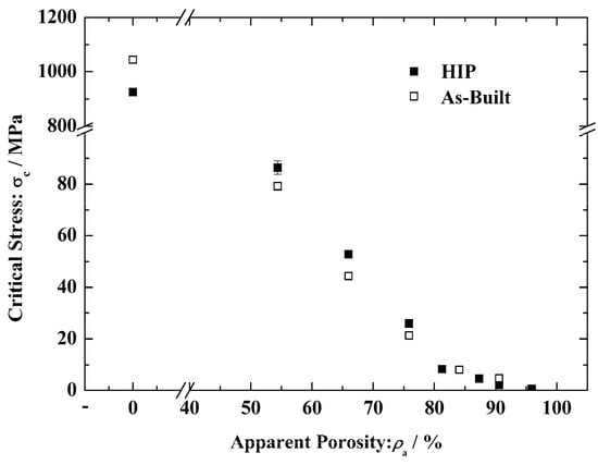 The relationship between critical stress and the apparent porosity of the as-built and HIP-treated porous scaffolds.