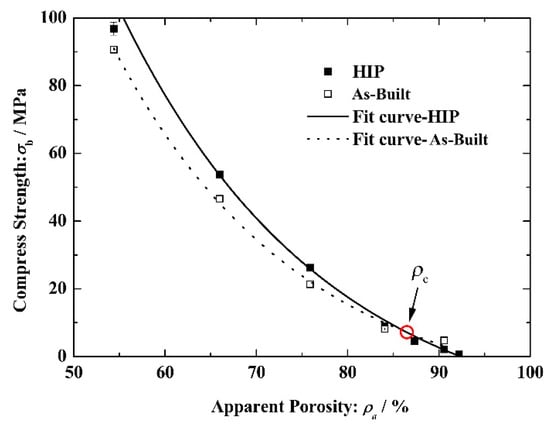 The compression stiffness, critical stress and compressive strengths varying with apparent porosity of scaffolds are shown in Figure 9, Figure 10 and Figure 11. The relationship between the mechanical indexes and apparent porosity can be described by an exponential function with various coefficients. The three parameters decrease with increasing apparent porosity and there is critical apparent porosity (ρc), as the relative position of the mechanical property parameters of the as built and HIP-treated changes when apparent porosity of the porous scaffolds cross the critical value. The mechanical properties of HIP-treated porous Ti6Al4V with lower apparent porosity were expected to be higher than that of the as-built ones but, on the contrary, the mechanical property parameters of porous Ti6Al4V with higher apparent porosity presented higher values, though the difference between as-built and HIP-treated samples was not significant.