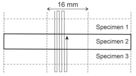 The heat-treated and polished specimens of maraging steel (l = 80 mm × w = 20 mm × t = 9.5 mm) were exposed to LSP in a confined mode using water as a transparent overlay and without an absorbent coating. In comparison to the conventional LSP with an absorbent coating, this technique uses lower laser pulse energy in order to avoid surface melting. This permits laser treatment to be performed without a sacrificial layer and allows for higher overlapping rates between laser spots, in our case between 78% and 92%. The LSP path mode on the specimens is presented in Figure 1. The direction of the laser processing was parallel to the rolling direction. Several specimens were exposed to LSP simultaneously. The width of the LSP area on each specimen was 16 mm. We used different combinations of laser pulse parameters. We changed the laser PD in a range from 900 to 2500 cm−2 with a step of 100 cm−2 at three different laser spot diameters (SDs; i.e., 1.5, 2.0, and 2.5 mm). The LSP processing parameters used in the experiment are presented in Table 3. The Laser pulse energy and the laser pulse duration were constant, i.e., 2.8 J and 10 ns, respectively. Therefore, the laser hit the specimen surface with a power density in a range between 5.7 and 15.8 GW·cm−2. We used a Q-switched Nd: YAG laser (model: Brilliant B, wavelength: 1064 nm, Gaussian spatial distribution; Quantel, Lannion, France) operating at 10 Hz.