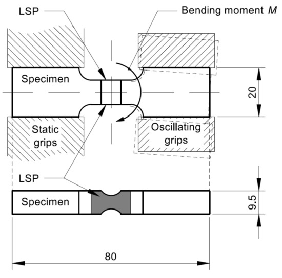 In order to obtain insight into the effects of LSP on the mechanical fatigue resistance of the chosen maraging steel, fatigue tests were carried out using a resonant testing machine, CRACKTRONIC (RUMUL, Neuhausen am Rheinfall, The Switzerland), which is a table model for dynamic bending load applications with testing frequencies between 40 and 300 Hz. The kinematic conditions allows for pure bending between the gripping heads. An electromagnetically driven resonator, built as a rotary oscillator, creates appropriate bending moments. The elastic modulus of a material and the specimen geometry have effects on the resonance frequency of the machine. The crack initiation and propagation in this unit reduce its cross-sectional area, which affects stiffness reduction and consequently resonance frequency, as stated also in [23]. This machine measures resonance frequencies with a resolution of 0.01 Hz. In this research, the bending moment M was applied in a sinusoidal wave form at a stress ratio R of 0.1. We chose this stress ratio to provide and keep the upper surface of the specimen, where we expected crack initiation, in tensile conditions during fatigue tests. The bending frequency was around 114 Hz. We further reduced the middle of the specimen to ensure higher semicircular bending stresses in this area (Figure 2). In our resonant tests, we applied bending moments in a range between 60 and 78 N·m. The parameters of fatigue loading used in the experiment are presented in Table 4. According to our simulation, the maximum bending moment within a fatigue cycle generated a load of 1082 MPa in the most critical point of the specimen. The stress map during the bending is represented in Figure 3. Stress analysis was simulated with a software package SolidWorks (v23, 2015) according to the finite elements method (FEM) (3DEXPERIENCE, Vélizy-Villacoublay, France).