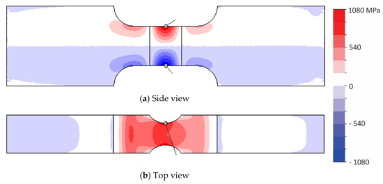 Stress maps during the bending within the fatigue specimen: (a) side-view stress map; (b) top-view stress map. The maximum stress indicated in red was approximately 1000 MPa. The bending moment was 78 N·m.