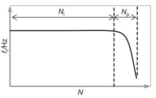Figure 4 shows the change of the resonant frequency in dependence of the number of fatigue cycles, where Ni represents an initiation period and Np indicates a propagation period. The resonant frequency, conditioned by the specimen’s geometry, began to decrease, when the fatigue crack occurred. This event, which also separated the fatigue crack initiation phase and the fatigue crack propagation phase, was chosen as the moment of failure. We did not measure specimens’ temperatures during the fatigue testing, and we did not notice any temperature increase in the specimens during and after the test. The CRACKTRONIC is a compact testing device, so heat generated in the specimen during the fatigue loading could possibly be transferred to the resonant device.