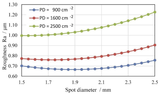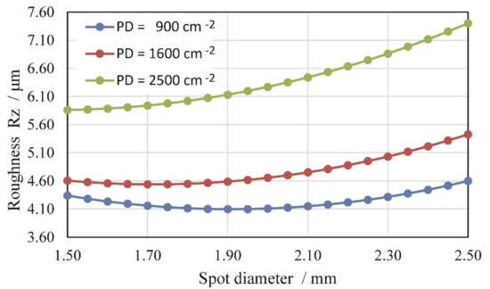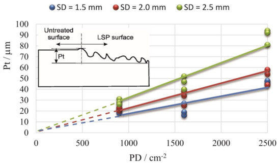 Profile depth (Pt) is a kind of important information for planning additional process operations after LSP, like grinding and polishing. It shows us the height difference between the untreated and LSP-treated surfaces (inserted in Figure 7). We can find out that increasing PD influences the increase of profile depth and it is more distinct at a large diameter of a laser spot. Profile depth increases linearly in conjunction with increasing PD. The line is tilt more greatly in the case of bigger SDs. Especially the trend of Pt results is very unfavorable when applying LSP with a laser SD of 2.5 mm (Figure 7). The surface profile was lowered by almost 100 µm in the case of PD = 2500 cm−2.