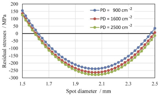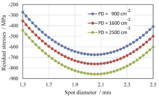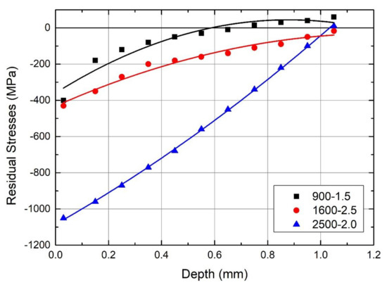Residual stress distributions in depth for different PDs (i.e., 900, 1600, and 2500 cm−2) and different SDs (i.e., 1.5, 2.0, and 2.5 mm).