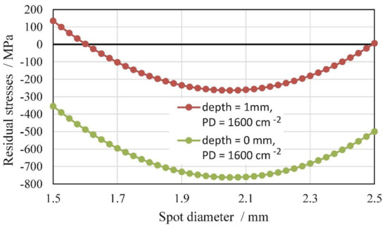 The plots of the average RSs at specified depths, shown in Figure 9 and Figure 10, suggest that the maximum compressive RSs were achieved with a 2.0 mm-diameter laser spot, both at the surface and at a depth of 1.0 mm. This could not be directly connected with the pulse power density (PPD) only, which is the highest with a 1.5 mm-diameter laser spot. The interaction between laser beam size and material affected the propagation nature of the shock waves. Smaller-diameter shock waves probably expand like spheres with a higher attenuation rate than larger-diameter shock waves, which behave like planar fronts [15,16,24,25]. This phenomenon, together with a higher overlapping rate between laser spots, may explain our findings. The RS profiles are almost the same for different PDs at a depth of 1.0 mm. The shift from big compressive RSs at the surface towards tensile RSs at a depth of 1.0 mm is between 400 and 600 MPa. In Figure 11, we can see a comparison of the RS profiles at the surface and at a depth of 1.0 mm for PD = 1600 cm−2.