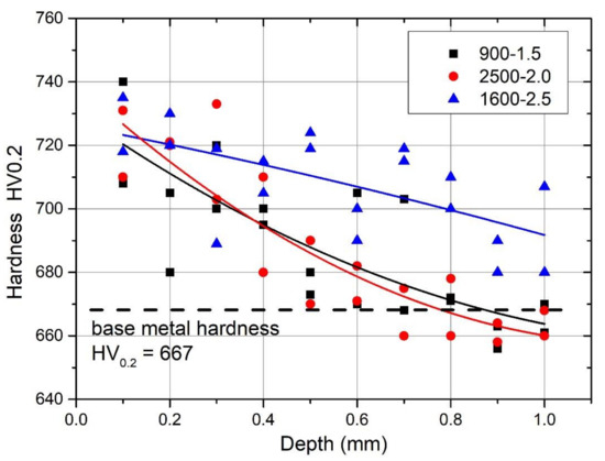 In-depth microhardness distributions were obtained with the standard Vickers test method using a Leitz Wetzlar hardness tester with a 200 g load and a 15 s load time. Vickers microhardness was measured at a depth of 2 mm from the LSP-treated surface (Figure 12). The microhardness analysis of the surface layer indicated that, after the LSP, strain hardening occurred. Strain hardening was detected as an increase in microhardness. The microhardness of the heat-treated maraging steel before the LSP was 667 HV0.2. The highest microhardness value after the LSP was measured just below the surface in a range between 730 and 740 HV0.2. The increased hardness was detected in the surface layer. The thickness of the strain-hardened surface was between 0.6 and 1.6 mm, depending on laser PD and laser SD.