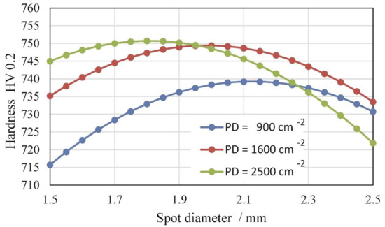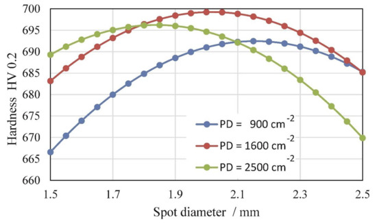 Microhardness at the surface as a function of laser SD for different PDs (i.e., 900, 1600, and 2500 cm−2).