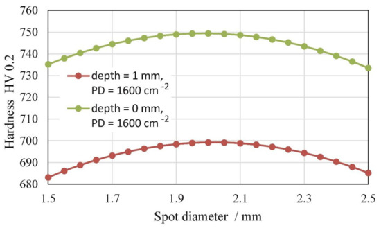 Interactions of laser PD and SD have a significant influence on the hardness of an LSP-treated surface, found by a statistical analysis (ANOVA) (P < 0.0001) [25]. We fitted the measured values with the quadratic model. The results are presented as contour plots for the whole range of laser SD from 1.5 to 2.5 mm. The contour plots, shown in Figure 13 and Figure 14, indicate that, in general, the maximum microhardness was achieved with a 2.0 mm-diameter laser spot, both at the surface and at a depth of 1.0 mm. Once again, this could not be directly connected with PPD. In the case of a 1.5 mm-diameter laser spot, the PPD was higher than in the case of a 2.0 or 2.5 mm-diameter laser spot. These findings confirm that, for our laser source, with a 2.0 mm-diameter laser spot, the most pronounced mechanical effect was obtained.