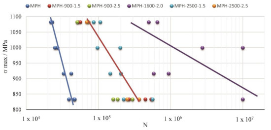 Figure 18a presents the failure locations on the specimens without LSP. The crack grew at the surface, because the LSP process slowed down thanks to the presence of the compressive RSs.