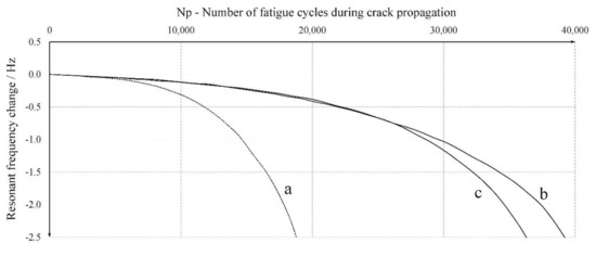 Resonant frequency behavior within the crack propagation phase during the fatigue bending: (a) MPH; (b) MPH-900-2.5; and (c) MPH-1600-2.0. The maximum bending moment was 78 N·m.