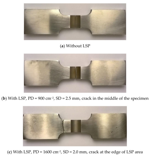 Fatigue crack and failure location on the specimen without LSP (a), the specimen with LSP for PD = 900 cm−2 and SD = 2.5 mm (b), and the specimen with LSP for PD = 1600 cm−2 and SD = 2.0 mm (c).